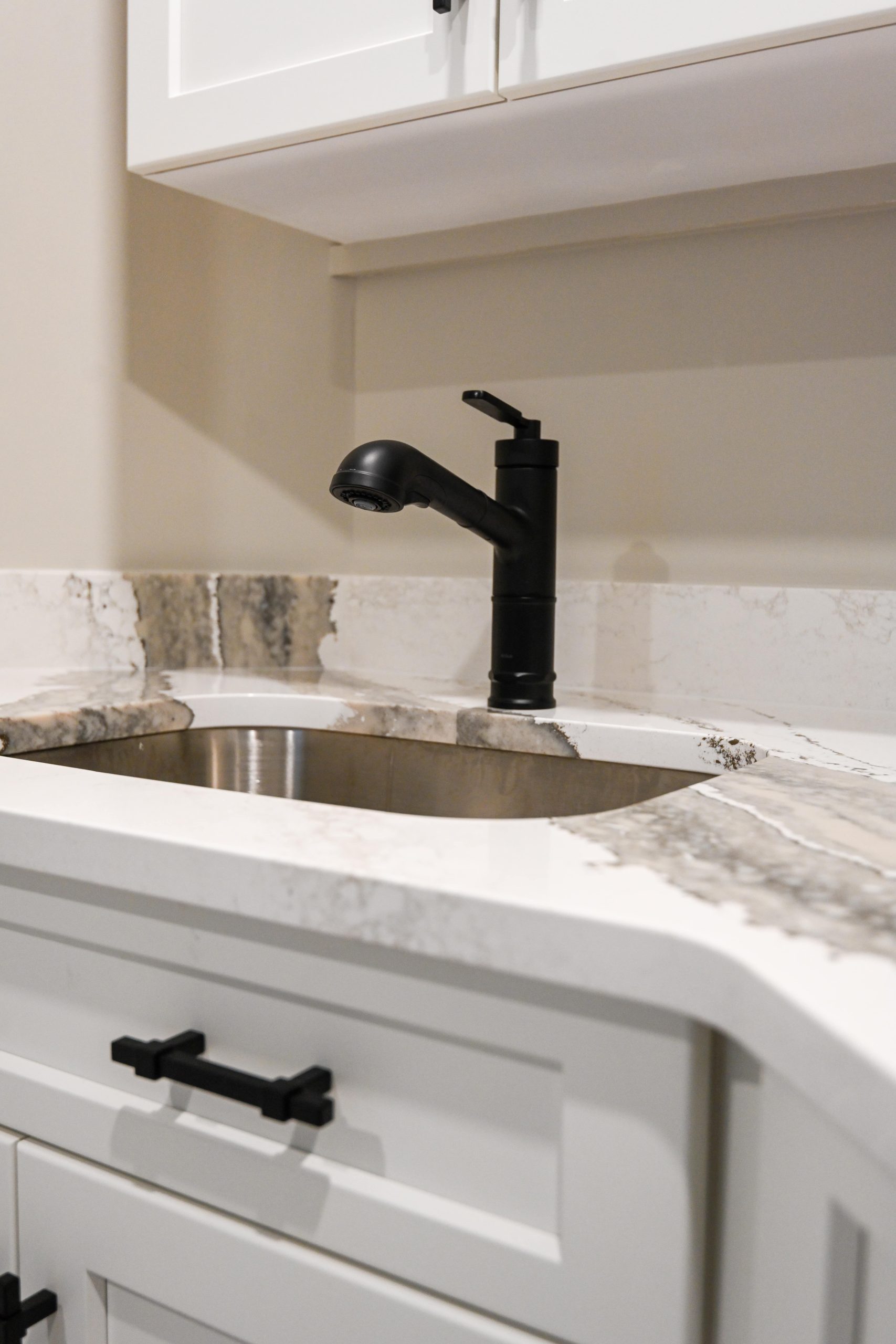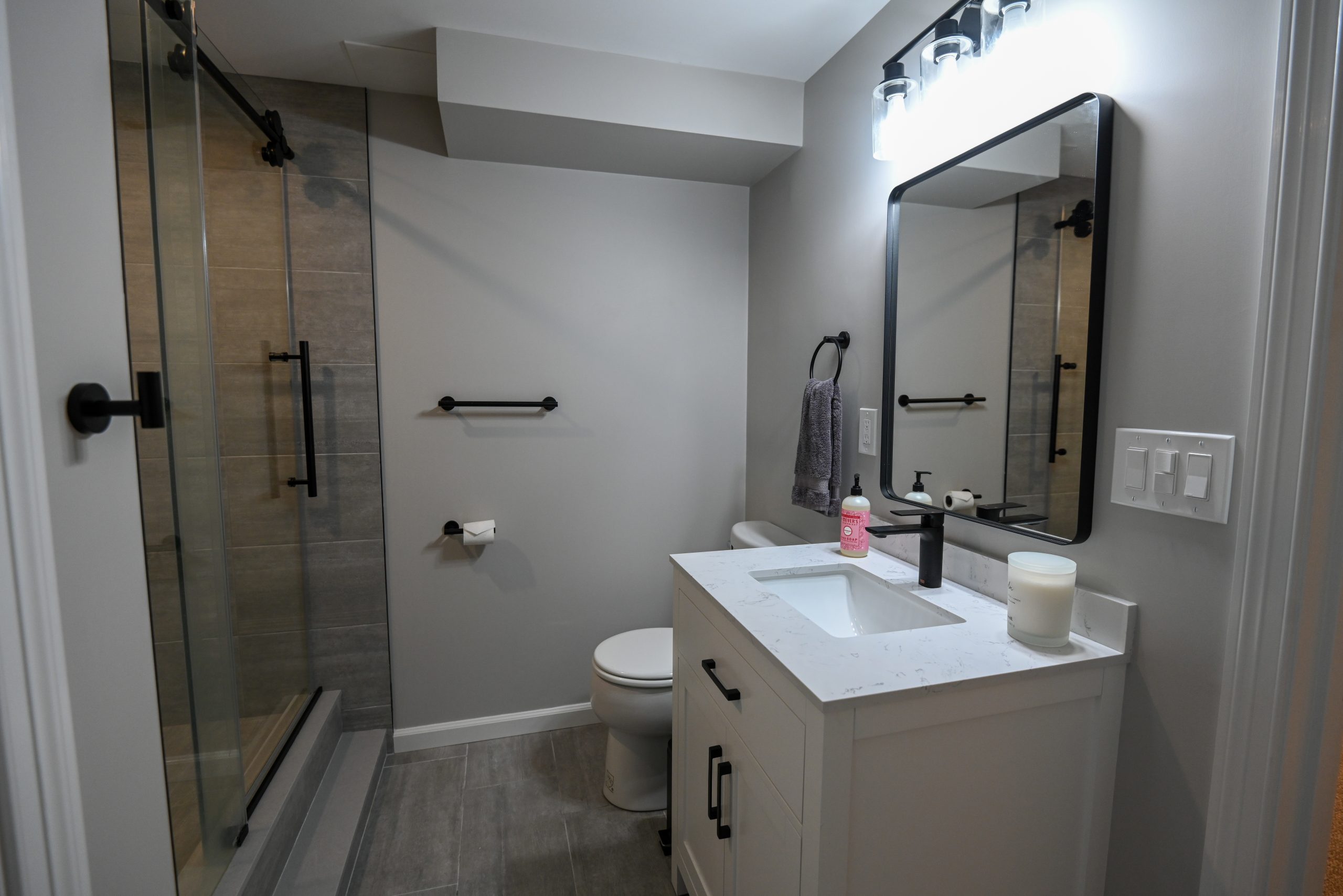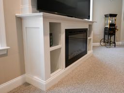 They wanted a cozy living room anchored by a custom fireplace built-in, a functional kitchenette for entertaining, a full bathroom with a tiled shower, and a private office/guest room — all finished with the same attention to detail found on the main floors of their home.